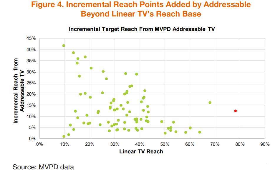 - アドレッサブルの追加リーチは効率的です。これは特に、リニアリーチが曲線上で停滞しているときに当てはまります。MVPDアドレッサブルは、リニアリーチよりも増分リーチの追加において20%から30%効率的であり、大きな違いがあります。