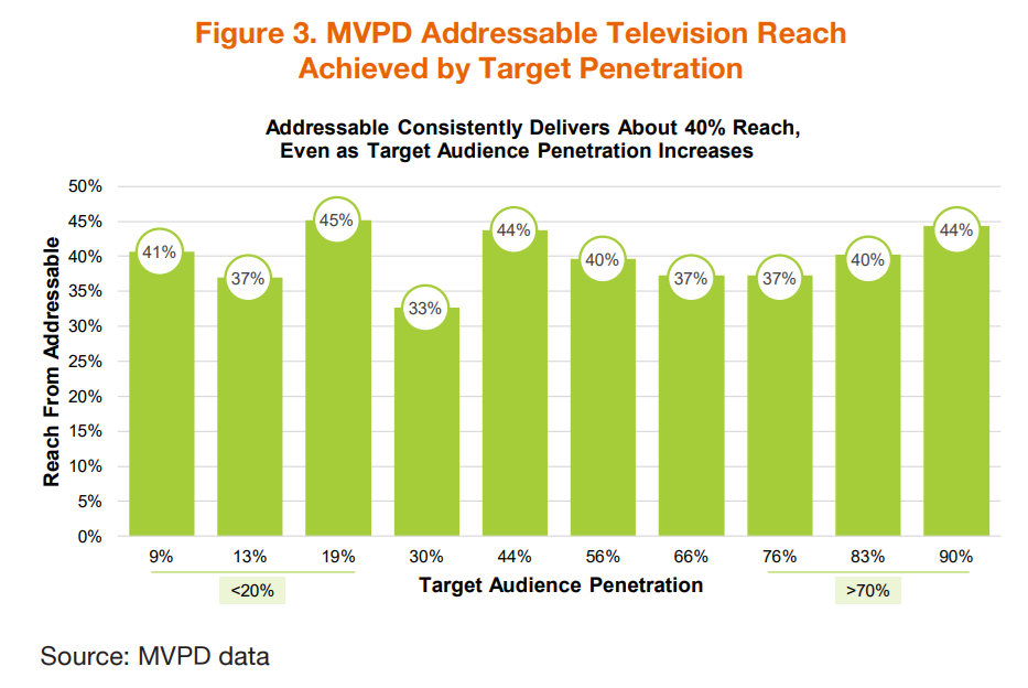 - MVPDアドレサブルがリニアよりも効率的になる境界線は、ターゲットオーディエンスの浸透率が43%です。これは、市場認識の30%のほぼ半分です。