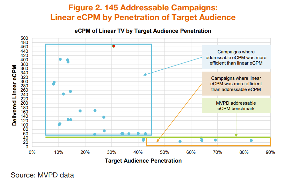 - これらのキャンペーンでは、MVPDアドレサブルテレビは、eCPMに基づいて、リニアテレビよりも効率的でした。