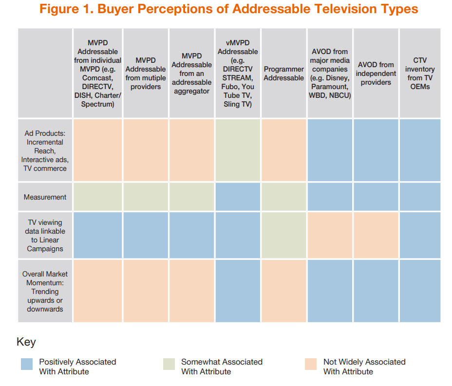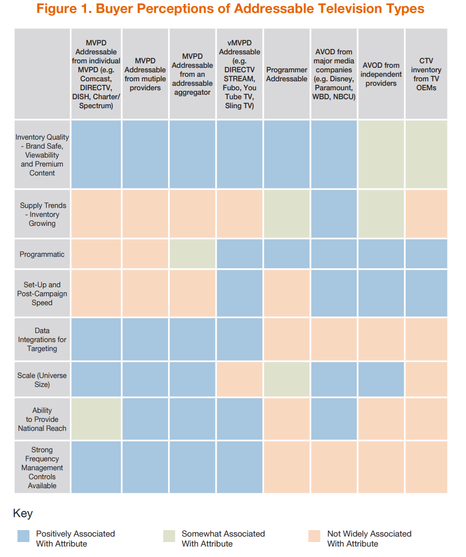 8つのアドレス指定可能なテレビ広告在庫プールに対するバイヤーの評価は、図1にまとめられています。