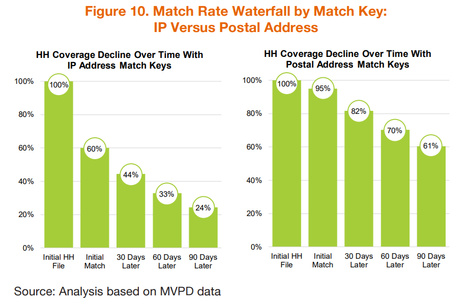 - 世帯ターゲティングはアドレッサブルテレビ広告の基盤であるため、マッチングプロセスの基盤となるID照合とIDグラフは非常に重要であり、MVPDアドレッサブルとCTVの間には大きな違いを生み出します。MVPDアドレッサブルは郵便番号に基づいており、CTVアドレッサブルはIPアドレスに基づいており、安定性と精度が低いです。