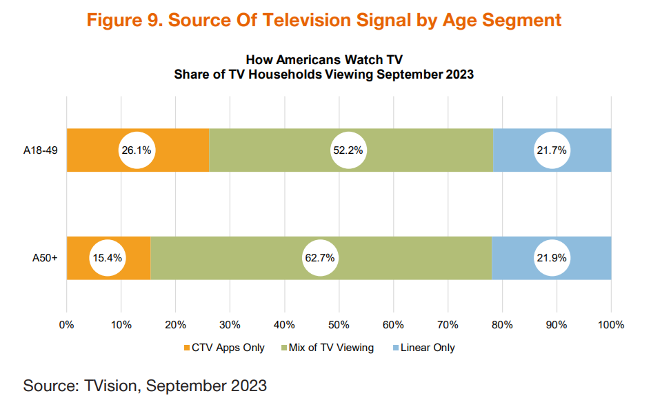 - 主にMVPDによって配信されるリニアTVは、18~49歳の成人の22%に 独占的にリーチしています