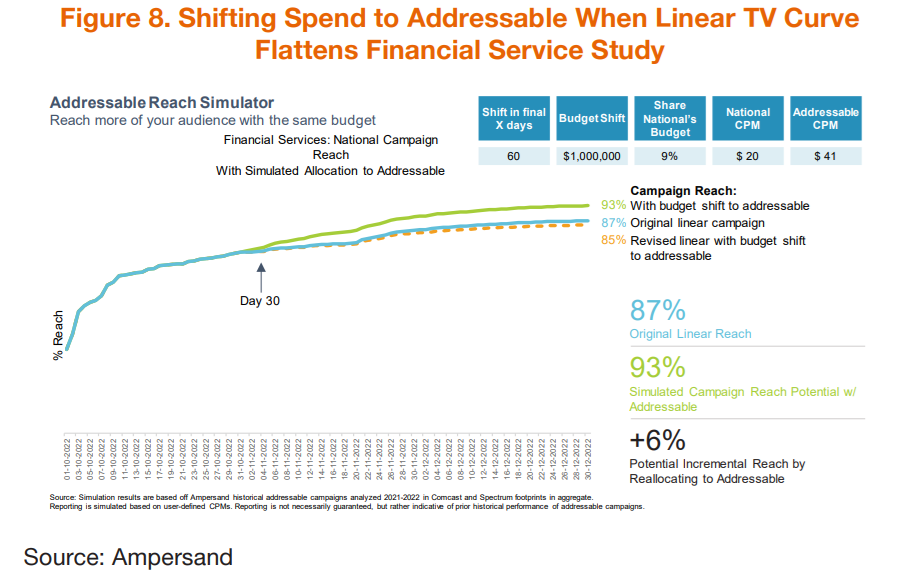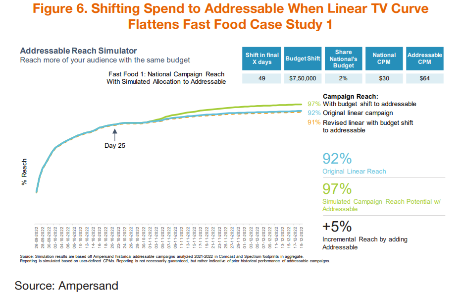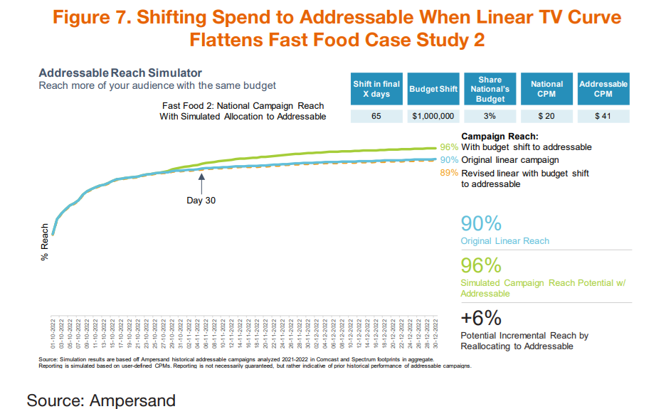 - Ampersandは、ComcastとCharter/Spectrumの配信地域において2021年と2022年に分析された過去のアドレッサブルキャンペーンに基づいて構築されたアドレッサブルリーチシミュレーターからケーススタディを提供しました。