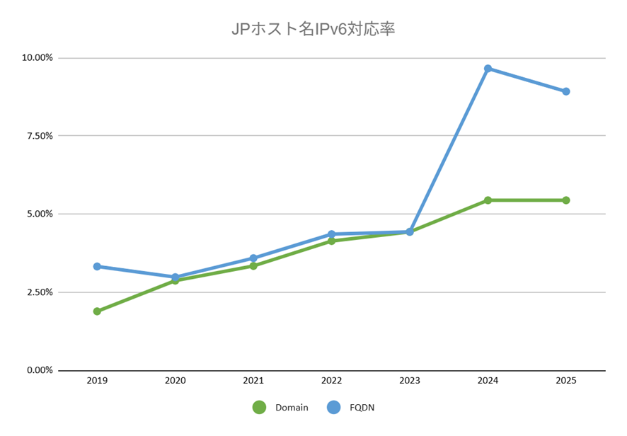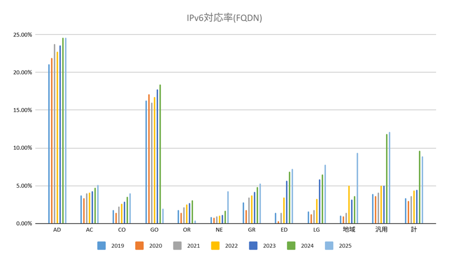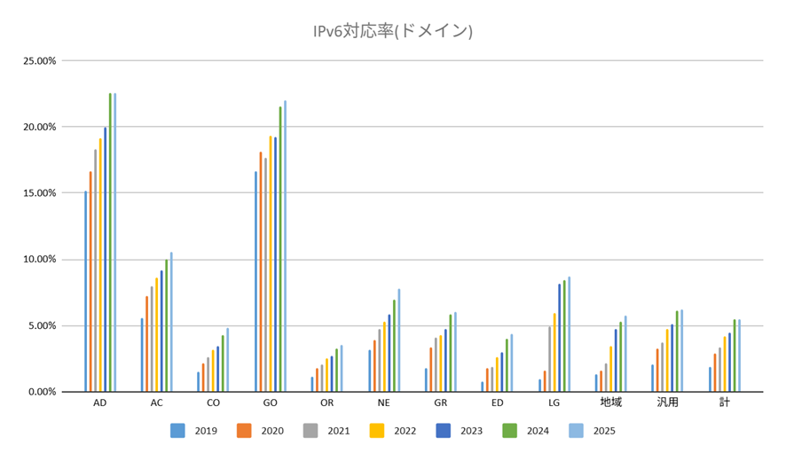 | ドメイン | IPv6率(2023) | IPv6率(2024) | IPv6率(2025) | |